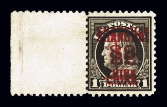 946 og K16a image#K16a, $2.00 on $1.00 Violet brown, double surcharge, left sheet-margin single, with the overprints spaced wide apart to show the doubling clearly, unlike so many that have the two overprints nearly on top of one another, deep rich color, o.g., minor h.r., a fine example of this very rare error; 1978 RPS certificate. (Image) $7,250.00
