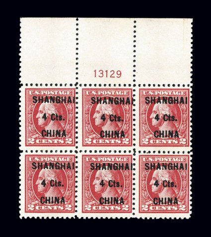 949 ogPB K18 image#K18, 4c on 2c Carmine, locally surcharged, full top plate no. 13129 block of six, fresh with deep rich color, crisp and intact, o.g., lightly hinged, attractive fine centering. (Image) $800.00