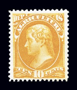 950 nh O5 image#O5, 10c Agriculture, a brilliantly fresh mint single, with especially rich color and a crisp impression, well centered within extravagantly wide margins, fresh clean o.g., never hinged, very fine and choice; 2000 PF certificate for a block of four, this being the top left stamp. (Image) for hinged $380.00