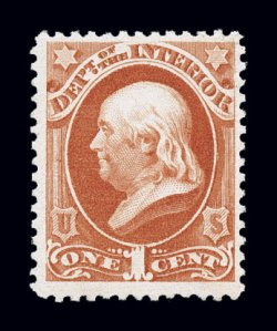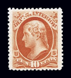 959 nh O100 image#O100, 10c Interior, on soft porous paper, a striking mint single, possessing margins of enormous width and being extraordinarily well centered within them, rich bright color, o.g., never hinged, an extremely fine large-margined gem; 1998 PF certificate. (Image) for hinged $100.00