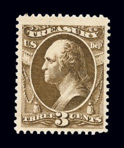 960 nh O109 image#O109, 3c Treasury, on soft porous paper, well centered within large margins, strong rich color, o.g., never hinged, very fine; 2004 PF certificates. (Image) for hinged $70.00