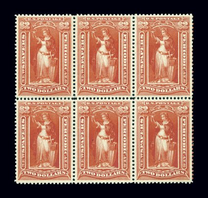 986 nhbl PR120 image#PR120, $2.00 Scarlet, a pristine mint block of six (3x2), extraordinarily fresh and vivid color, wonderfully well centered for a multiple of this size, pristine o.g., n.h., very fine-extremely fine; cataloged as six never hinged singles. (Image) $300.00+