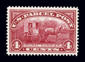 987 nh Q4 image#Q4, 4c Parcel Post, a gem mint single that is impeccably well centered amid large and perfectly balanced margins, particularly vibrant color and a well incised impression, o.g., n.h., extremely fine; 2003 PF certificate. (Image) $110.00