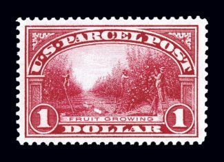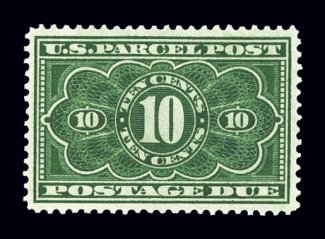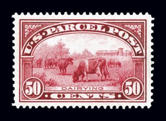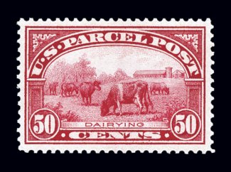 991 nh Q10 image#Q10, 50c Parcel Post, an eye-catching mint single that is not only exceedingly well centered within lavishly large margins, but also possesses a strikingly intense color and deeply etched impression on immaculate white paper, o.g., n.h., an extremely fine gem in every regard; 2002 PF certificate. (Image) $700.00