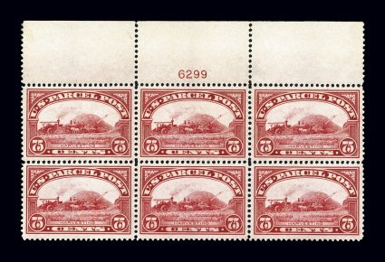 993 nhPB Q11 image#Q11, 75c Parcel Post, a spectacular full top margin plate no. 6299 block of six, being marvelously well centered throughout, with each stamp being precisely centered and possessing an impressive overall brilliance and freshness, with deep "fiery" color and a razor-sharp impression on bright paper, immaculate o.g., n.h., few sensibly rejoined perforations in the top selvage but remarkably crisp for this, extremely fine; a rare plate block in any condition, but in this gem quality this plate block is almost in a class by itself; clear 1983 PF certificate. (Image) $4,500.00