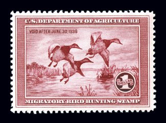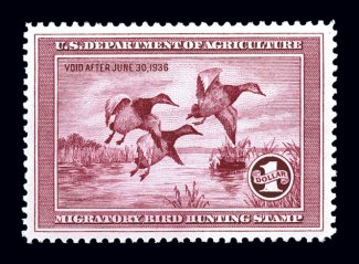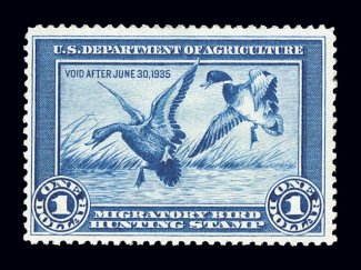997 nh RW1 image#RW1, 1934 $1.00 Blue, deeply rich color, nicely centered and margined, o.g., n.h., very fine; 2003 PSE certificate. (Image) $800.00
