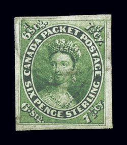 1081 O 9 image#9, 1857 7 1/2p Green, an exceptionally attractive used example with attributes seldom found on this classic stamp, including possessing four very large and well balanced margins, unusually bright color on fresh paper, plus an exceptionally light strike of an unobtrusive numeral in target cancel that does not hide the lovely features of this stamp, extremely fine; a highly desirable stamp in this outstanding condition (Unitrade C$4,500.00). (Image) $2,500.00