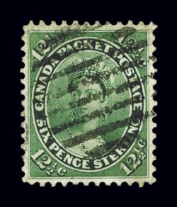 1083 O 18a image#18a, 1859 12 1/2c Blue green, an absolutely spectacular quality used example, in a condition that would be next to impossible to duplicate, possessing near flawless centering amid extravagantly large margins, plus its color could not be more intense and rich, neatly cancelled with central strike of rimless grid, extremely fine; a true condition rarity in this superb condition; 1997 PF certificate (Unitrade $175.00). (Image) $95.00