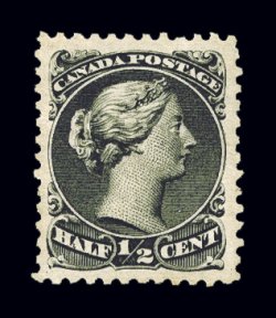 1085 og 21 image#21, 1868 1/2c Black, Q a lovely mint example, possessing magnificent centering within very large margins, strikingly intense color and a razor-sharp impression, virtually full o.g. with unduly harsh certificate stating slightly disturbed, though it is little more than hinged, extremely fine; a very scarce stamp in this select quality; 2001 Greene Foundation certificate (Unitrade C$250.00). (Image) $70.00