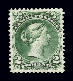 1091 og 24b image#24b, 1868 2c Deep green on thin paper, handsome mint single, possessing deep intense color and impression on fresh white paper, unusually full even perforations, quite well centered, full o.g., minor h.r., vertical gum bend, otherwise very fine and attractive; clear 2001 Greene Foundation certificate (Unitrade C$2,000.00). (Image) $625.00
