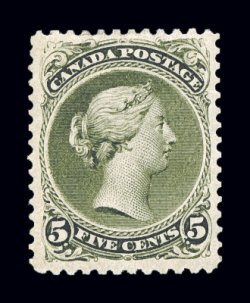 1093 og 26 image#26, 1875 5c Olive green, an extraordinarily choice mint single of this scarce and difficult Large Queen value, beautifully centered within uncharacteristically large margins, rich sumptuous color, all surrounded by full even perforations, full o.g., lightly hinged, extremely fine; an exceedingly rare stamp in this select original gum condition; 1995 PF certificate (Unitrade C$4000.00). (Image) $1,000.00