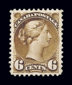 1103 og 39b image#39b, 1872 6c Yellow brown, perforated 11 1/2x12, select mint single, magnificently well centered amid large margins, fresh and bright yellow brown color with a sharp impression, large part o.g., extremely fine; 1992 Greene Foundation ("o.g.") and 2003 PF ("part o.g.") certificates (Unitrade C$1,000.00). (Image) $625.00