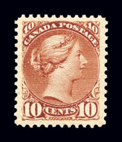 1106 og 45 image#45, 1897 10c Brown red, incredibly well centered mint single amid extraordinarily large margins, gorgeous rich color and a crisp impression, plus possessing perfect even perforations all around, full o.g., very lightly hinged, extremely fine gem and quite rare in this superlative condition; 1999 Greene Foundation certificate as never hinged (Unitrade C$800.00). (Image) $425.00