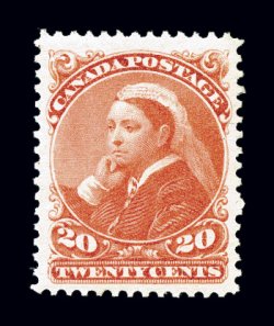 1107 og 46 image#46, 1893 20c Vermilion, attractive mint single, radiant color, well centered with large margins, full o.g., h.r., accompanying certificate mentions gum skips, but probably meant gum wrinkles which are very light and minor, choice very fine; 2003 Greene Foundation certificate (Unitrade C$600.00). (Image) $300.00
