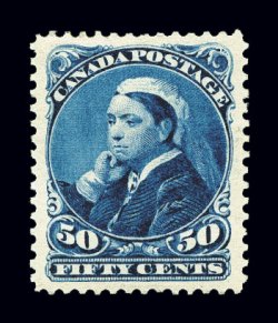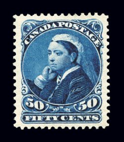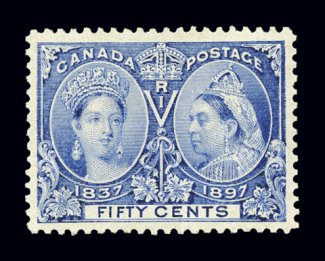 1120 nh 60 image#60, 1897 50c Jubilee, an extraordinarily choice mint example of this attractive value, being marvelously well centered amid large balanced margins, strong ultramarine color and a sharp detailed impression, pristine o.g., n.h., extremely fine; a rare stamp in this superior quality; 1995 PF certificate (Unitrade C$975.00). (Image) $550.00