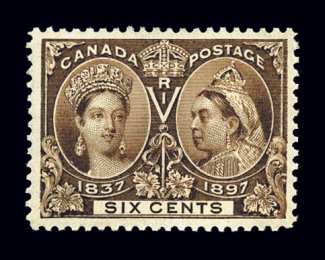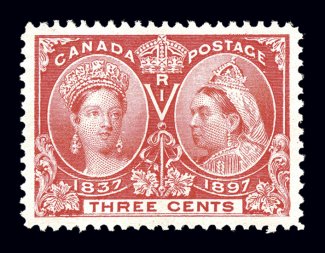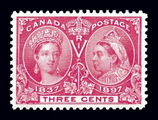 1111 nh 53 image#53, 1897 3c Jubilee, flawlessly centered within large and perfectly balanced margins, brilliant color, pristine o.g., n.h., extremely fine (Unitrade C$75.00). (Image) $31.50