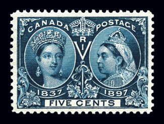 1112 nh 54 image#54, 1897 5c Jubilee, extraordinarily well centered within large margins, rich deep color and a razor-sharp impression on fresh white paper, flawless o.g., n.h., extremely fine; 2003 Greene Foundation certificate (Unitrade C$180.00). (Image) $95.00