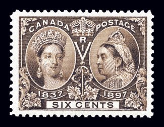 1113 nh 55 image#55, 1897 6c Jubilee, a phenomenal mint example of this scarcer value, in a condition that is almost unheard of on the Jubilee issues, sporting absolutely enormous margins and being incredibly well centered within them, additionally this marvelous stamp possesses incredibly deep and luxuriant color, with a razor-sharp impression on brilliantly fresh paper, pristine o.g., never hinged, a superb gem for the most demanding quality conscious collector; 1999 PF certificate (Unitrade C$900.00). (Image) $450.00