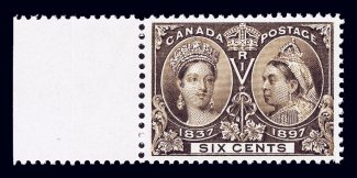 1114 nh 55 image#55, 1897 6c Jubilee, left sheet-margin single, exceedingly well centered, deep intense color and impression, pristine o.g., n.h., extremely fine; a premium quality example of this difficult value; photocopy of a 2001 PF certificate for a block of four, this being the top left stamp (Unitrade C$900.00). (Image) $450.00