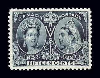 1117 nh 58 image#58, 1897 15c Jubilee, especially well centered within large balanced margins, lovely rich color, unblemished o.g., n.h., trivial light wrinkle, extremely fine; 2003 Greene Foundation certificate (Unitrade C$900.00). (Image) $450.00
