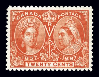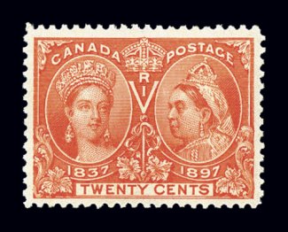 1118 nh 59 image#59, 1897 20c Jubilee, "post office" fresh, with gorgeous radiant color and an outstanding impression, exceedingly well centered within large margins, o.g., n.h., extremely fine and very pretty; 2005 Greene Foundation certificate (Unitrade C$900.00). (Image) $450.00