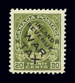 1181 nh MR2Ci imageUnitrade #MR2Ci, 1915 20c Olive green with "Inland/Revenue/War/Tax" overprint, exceptionally fresh mint single of this undervalued stamp, sumptuously rich color and an intense impression, o.g., n.h., very fine. (Image) Unitrade C$180.00