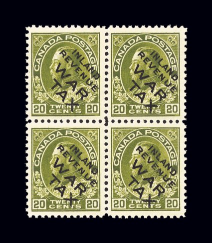 1182 nhbl MR2Ci imageUnitrade #MR2Ci, 1915 20c Olive green with "Inland/Revenue/War/Tax" overprint, mint block of four, deeply rich color and impression, o.g., n.h., very fine. (Image) Unitrade C$720.00+