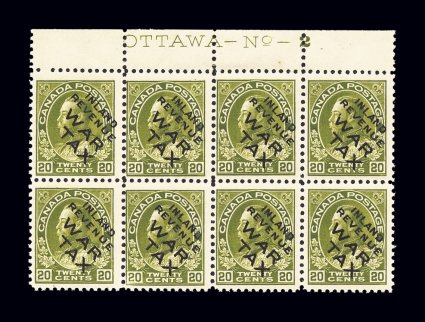 1183 ogPB MR2Ci imageUnitrade #MR2Ci, 1915 20c Olive green with "Inland/Revenue/War/Tax" overprint, top margin imprint and plate "No. 2" block of eight, deep intense color and a crisp impression, pristine o.g., stamps n.h., lightly hinged in the top selvage only , fine-very fine; plate blocks of this stamp are rarely offered and are not priced; cataloged simply as eight never hinged singles. (Image) Unitrade C$1,440.00+