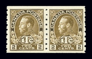 1184 og MR7iii image#MR7a var., 1916 2c + 1c Yellow brown war tax coil, mint pair, extraordinarily well centered and margined, strong rich color in the distinctive yellow brown shade, o.g., lightly hinged, extremely fine; 1994 Greene Foundation certificate (Unitrade #MR7iii; C$550.00). (Image) $250.00