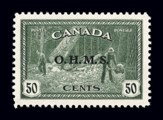 1185 nh O1-10 image#O1-10, 1949-50 1c-$1.00 O.H.M.S. Officials cplt., a beautifully select set that could hardly be improved upon, each is virtually perfectly centered within large margins, "post office" fresh with bright colors, o.g., n.h., extremely fine (Unitrade C$528.00). (Image) $287.90