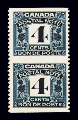 1186 nh FPS6a imageVan Dam #FPS6a, 1932 4c Blue Postal Note, vertical pair, imperforate horizontally, an immaculate mint example of this very scarce and seldom offered error, deep prooflike color and impression on pristine white paper, o.g., n.h., very fine. (Image) Van Dam C$500.00