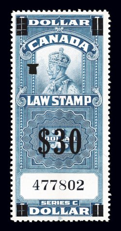 1187 O FSC20 imageVan Dam #FSC20, 1935 "$30" on $1.00 Blue Law Stamp, with vertical bars, exceptionally fresh, with rich luxuriant color on brilliantly white paper, neat small punch cancel, very fine. (Image) Van Dam C$500.00