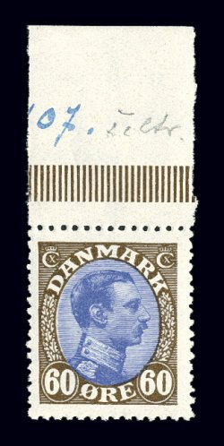 1194 nh 123a image#123a, 1919 60o Brown and ultramarine, an impressive top left corner margin mint single of this scarce shade, with "No. 173-K" in selvage, strong rich colors, pristine o.g., n.h. (hinged in the far top selvage only), very fine; photocopy of a 2002 Nielsen opinion for the block of four from which this came (Facit #156b; SK5,000). (Image) $350.00
