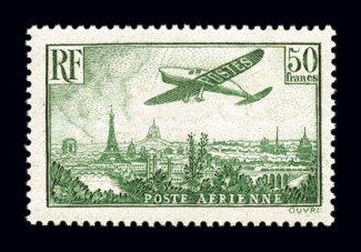 1196 nh C14 image#C14, 1936 50Fr Emerald Plane over Paris, an especially choice "post office" fresh mint single, possessing rich luxuriant color and a sharp impression on pristine white paper, exceedingly well centered as well, immaculate o.g., n.h., an extremely fine gem (Yvert #A14; €1,550). (Image) $900.00