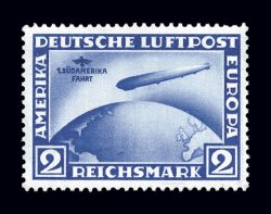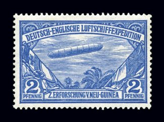 1197 nh Sieger #1 imageSieger #1, 1913 2pf Ultramarine Zeppelin, which was prepared but never issued because the special flight these were to be on never took place, very well centered, o.g., n.h., exceedingly fresh and very fine; only a small number exist. (Image) Sieger €1,000