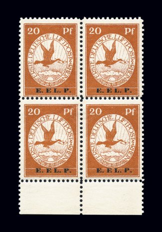 1199 nhbl Michel V, VI imageMichel #V, VI, 1912 10pf and 20pf Air post, with "E.EL.P" overprint cplt. in margin blocks of four, the 10pf being a top margin and the 20pf bottom margin, well centered (especially the rare 10pf value), exceedingly fresh, o.g., n.h., very fine; blocks of this air post set are rare, especially so in this outstanding condition; 1998 Maria Brettl certificate. (imagea) (Image) MIchel €10,600+