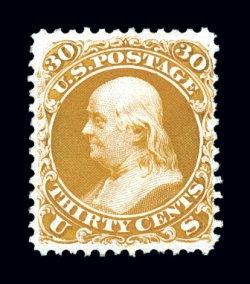 128 ng 110 image#110, 30c Brownish orange re-issue, an impressive unused example of this rare and always difficult value, possessing far better centering than usually encountered, plus it color is incredibly deep and rich, while its impression is razor-sharp on pristine white paper, very fine; only 346 sold; 2002 PF certificate. (Image) $3,750.00