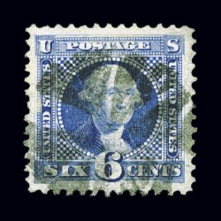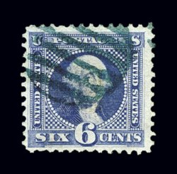 137 O 115 image#115, 6c Ultramarine, well centered within large margins for this notoriously difficult value, rich color, and wonderfully complemented by a lovely fancy encircled blue grid cancellation, very fine and choice; 1999 PF certificate. (Image) $245.00
