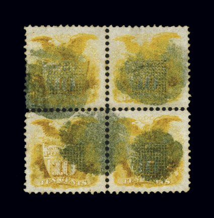 139 Obl 116 image#116, 10c Yellow, a very rare used block of four, exceptionally well centered, rather bold and slightly smudgy circular cork pmks., flaws including light overall toning and small repair on bottom left stamp, very fine centering; one of five recorded Ten Cent 1869 Pictorial used blocks of four; 1998 PF certificate. (Image) $8,000.00