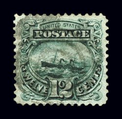 140 O 117 image#117, 12c Green, exceptionally well centered within uncharacteristically large margins, prooflike color and impression on bright paper, light central target cancel, extremely fine; 1997 PF certificate. (Image) $160.00