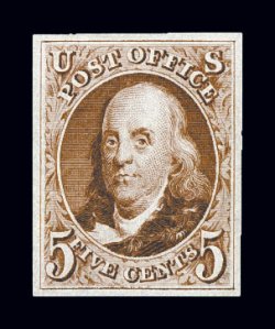 3 og 30 image#30, 5c Orange brown, Ty. II, very well centered within extraordinarily wide margins, intensely rich color and impression, full o.g., extremely fine; an uncommonly choice example of this scarce stamp; 2006 PSE certificate (VF-XF 85; SMQ $1,900.00). (Image) $1,250.00