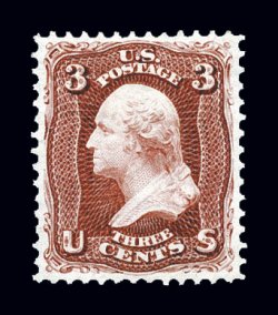20 og 104 image#104, 3c Brown red re-issue, an exciting mint example that is certainly one of the finest in existence of the mere 465 sold, as this marvelous stamp features several exceptional physical characteristics that rarely converge on a single example, including being remarkably fresh, with stunningly rich color and an impression that could not be more deeply incised on brilliantly white paper, plus it is extraordinarily well centered within large margins, o.g., lightly hinged, an extremely fine gem for the finest collection; 1988 PF certificate. (Image) $4,500.00