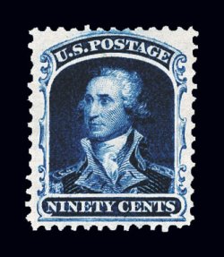 12 og 72 image#72, 90c Blue, a striking mint top sheet-margin single of this very scarce high value, featuring rich vibrant color and a razor-sharp impression on fresh white paper, unusually well centered within exceptionally large margins, part o.g., very fine and a wonderfully choice stamp; 1981 PF certificate. (Image) $3,500.00