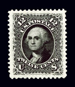 21 og 107 image#107, 12c Black re-issue, an superlative mint example of this scarce re-issue in a quality which, unquestionably, places it among the finest, if not the finest known of the 389 issued, possessing absolutely perfect centering amid the most lavish margins imaginable, intense "jet" black color and a vivid impression on bright fresh paper, full clean o.g., lightly hinged, an extremely fine gem whose equal probably does not exist; 1974 and 1997 PF certificates. (Image) $5,500.00