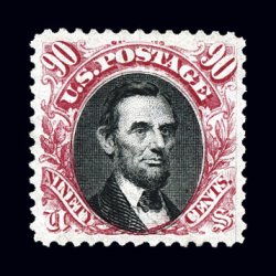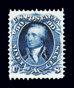 22 og 111 image#111, 90c Blue re-issue, an extraordinarily choice mint example of this re-issue rarity, being exceedingly well centered within large margins, plus it features deep luxuriant color and an outstanding prooflike impression on bright white paper, full o.g., lightly hinged, extremely fine; very few of the 317 sold are found both this fresh and well centered; 1982 and 2003 PF certificates; ex-Drucker. (Image) $7,250.00