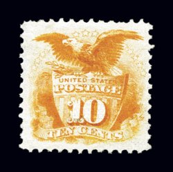 25 og 116 image#116, 10c Yellow, excellent centering within large margins, bright color, full o.g., two slightly shorter perfs. at top, otherwise extremely fine; 2006 PSE certificate (VG-F 60; an unduly harsh grade considering this stamp's exceptional centering; SMQ unpriced in this grade). (Image) $2,500.00