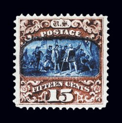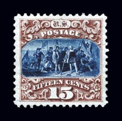 27 og 119 image#119, 15c Brown and blue, Ty. II, a highly desirable mint example, possessing an overall freshness and brilliance few others can boast, with deep luxuriant colors and well incised impressions on clean paper, extraordinarily well centered within very large margins which are most uncharacteristic of this stamp, o.g., relatively lightly hinged, extremely fine; an especially rare stamp in this exceptional quality; undated PSE certificate #25499 accompanies. (Image) $4,000.00