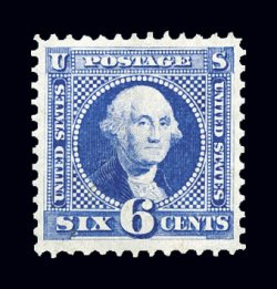 30 og 126 image#126, 6c Blue re-issue, a most impressive mint example of this very scarce and difficult value, rich vibrant color and a clean impression on bright paper, outstanding centering within uncharacteristically large margins, especially full and intact perforations all around, full clean o.g. that has been relatively lightly hinged, extremely fine; a particularly rare stamp in this gem condition; only 2,226 sold; 1988 PF certificate. (Image) $2,250.00