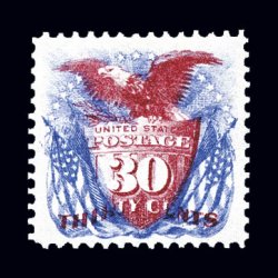 39 og 143 image#143, 30c Black with grill, an exciting mint example of one of the rarest stamps in all of U.S. philately to find both sound and still retaining its original gum, with this particular stamp possessing far better centering than normally found, as most have the design touching or cutting into the perforations, strong color and impression, several identifiable grill points at left, full original gum that has been lightly hinged, very fine; a review of our records shows this to be only the third sound full original gum Thirty Cent Grilled Banknote we have ever offered, despite our firm having offered many of the most important mint United States collections to have come on the market in the last ten years; 1999 PSE and 2000 PF certificates. (Image) $19,000.00