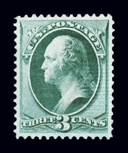37 og 136 image#136, 3c Green with grill, an outstanding mint example that is impeccably well centered within large and well balanced margins, fresh color, unusually well defined grill, o.g., lightly hinged, extremely fine; 1995 PSE certificate. (Image) $750.00
